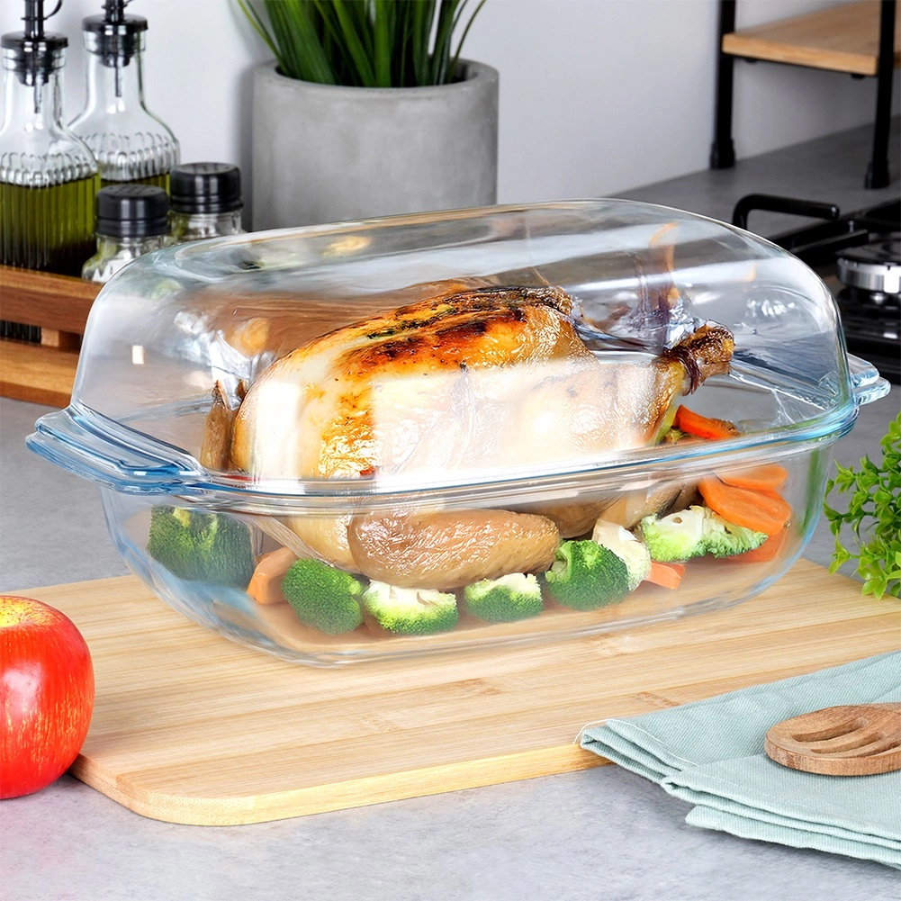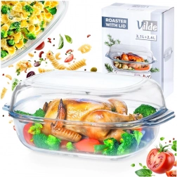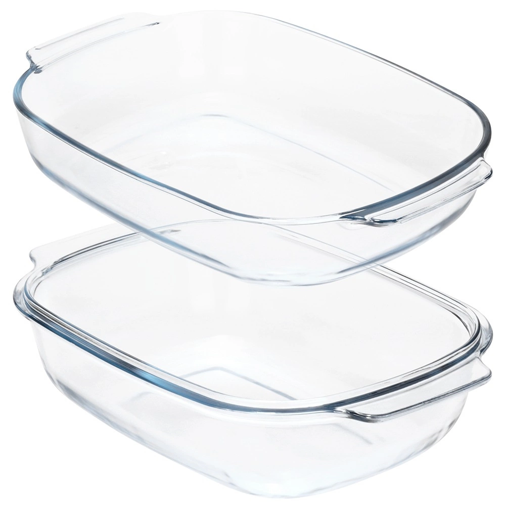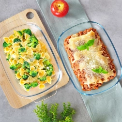 Ez a kétdarabos szett két téglalap alakú, hőálló üvegtálból áll, amelyeket használhat külön-külön, vagy összeilleszthet – az egyik rész praktikus fedőként szolgál, amely megőrzi az ételek nedvességét és szaftosságát. A tartós boroszilikát üvegnek köszönhetően -30 °C és +400 °C közötti hőmérsékletet is bír, így ideális húsok, lasagne, burgonya, zöldség és édes felfújtak sütéséhez.