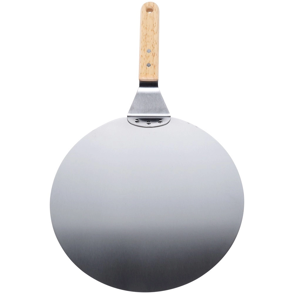 Ez a kerek acél pizzasütő lapát 48,5 × 30,5 × 9 cm-es méretben megkönnyíti a pizza és más sült finomságok kezelését. A matt rozsdamentes acél hosszú élettartamot és könnyű becsúszást a tészta alá biztosít, míg a fa nyél biztos és kényelmes fogást nyújt.