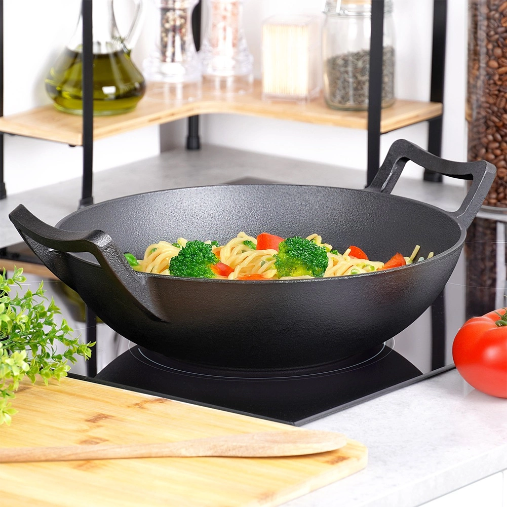 A masszív öntöttvas test stabil hőmérsékletet biztosít a teljes felületen – ideális a gyors stir-fryhoz és a lassú pároláshoz is.