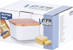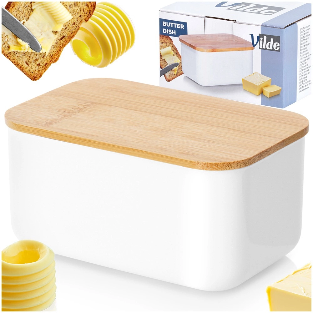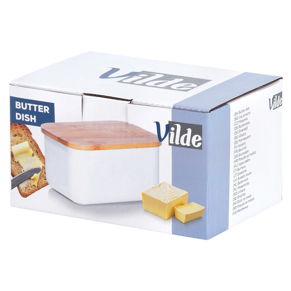 Elegáns, mindennapi használatra készült vajtartó, amely a fehér színű, tartós acélt és a természetes bambusz fedelet ötvözi a stílusos tároláshoz és tálaláshoz. Klasszikus formája és kompakt méretei miatt bármely konyhába illik, a vajat sokáig frissen tartja, és könnyen tisztítható.