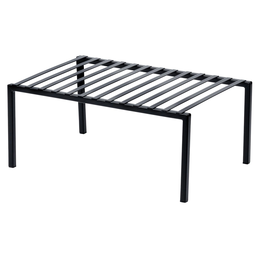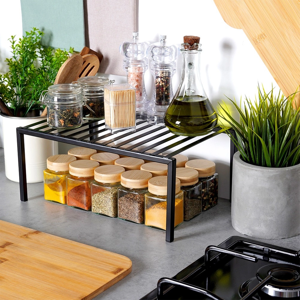 Praktikus, tartós fémből készült, fekete színű konyhai polc, amely két szintes tárolóhelyet alakít ki szekrényekben és a munkalapon is. Segít helyet megtakarítani, áttekinthetően elrendezni a tányérokat, tálakat, bögréket, fűszereket és apróságokat, valamint a stabil kialakításnak köszönhetően ideális a konyhába, kamrába, fürdőszobába és irodába is. Méretek: 33 × 21 × 14 cm.