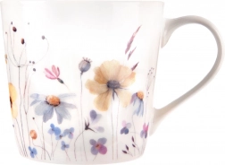 Elegáns porcelán bögre 430 ml űrtartalommal, finom mezei virágdekorral, ideális a mindennapi tea, kávé és kakaó fogyasztásához. Kényelmes füllel, klasszikus formával és fényes mázzal a könnyű tisztításért. Mosogatógépben mosható és mikrohullámú sütőben is használható.