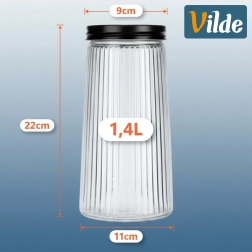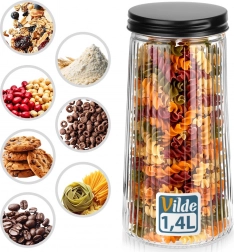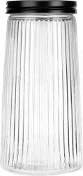 Elegáns, 1,4 l űrtartalmú üvegedény fekete, csavaros fedéllel, amely tovább frissen tartja az élelmiszereket. Tartós bórszilikát üvegből készült dekoratív bordázással, amely biztosítja a stílusos megjelenést és a biztos fogást. A légmentes zárásnak köszönhetően ideális kávéhoz, tésztához, liszthez, diófélékhez vagy müzlihez, a áttetsző üveg pedig gyors rálátást ad a tartalomra.