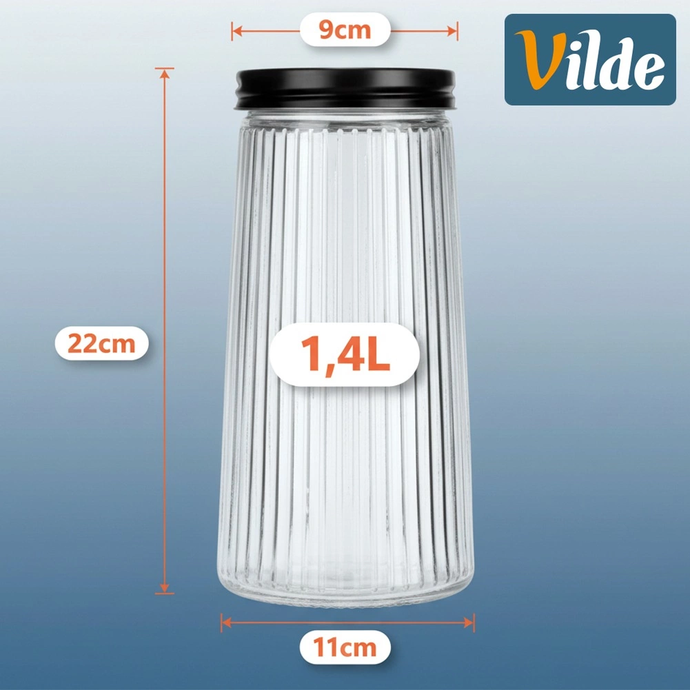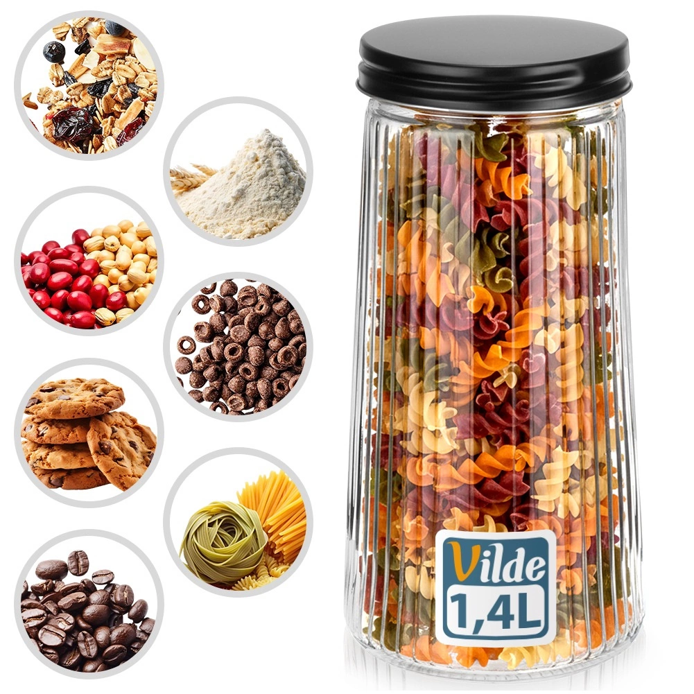 Ez a praktikus és dizájnos, 1,4 l űrtartalmú konyhai tároló segít rendben tartani a kamrát és frissen megőrizni az élelmiszereket. A kiváló minőségű bórszilikát üveg ellenáll a hőmérséklet-változásoknak, a bordázott felület pedig modern megjelenést és biztosabb fogást ad. A csavaros fém fedél fekete színben szoros zárást biztosít, megóvva az alapanyagok aromáját és roppanósságát.