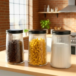 Ez az univerzális konyhai tárolóedény ötvözi az elegáns megjelenést a praktikus használattal. Az átlátszó üveg megkönnyíti a készletek áttekintését, míg a masszív, csavaros fedél fekete színben segít megőrizni a tárolt élelmiszerek frissességét és aromáját. Tökéletesen illik modern és klasszikus konyhákba is.