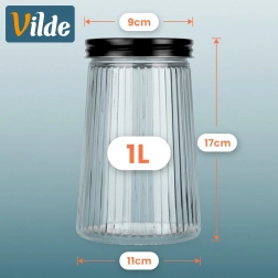 Praktikus, 1 liter űrtartalmú üveg tárolóedény csavaros fém fedéllel, amely tovább frissen és szépen rendszerezve tartja az élelmiszereket. Tartós boroszilikát üvegből készült, elegáns bordázott dizájnnal, amely megkönnyíti a tartalom és a mennyiség ellenőrzését. Ideális kávé, tészta, cukor, diófélék és más száraz alapanyagok számára.