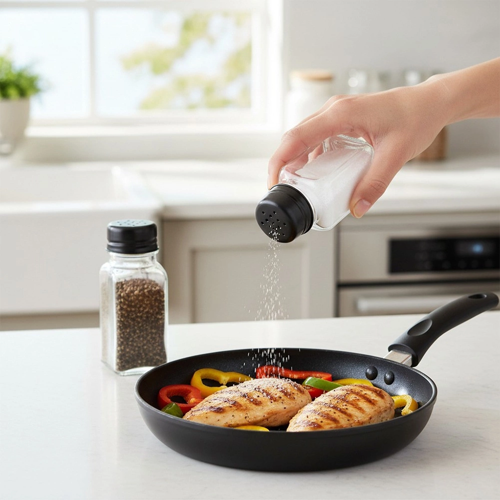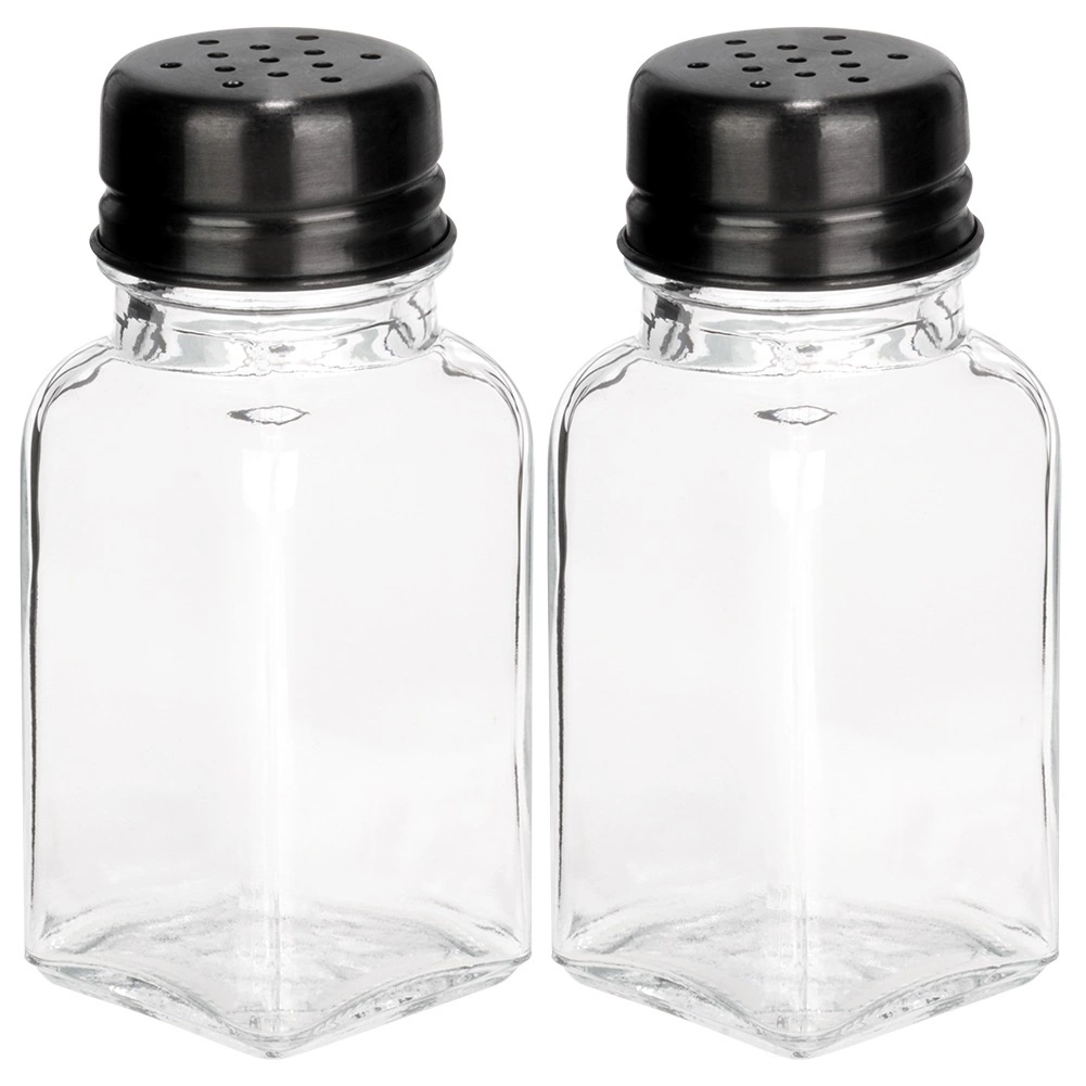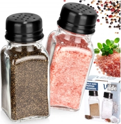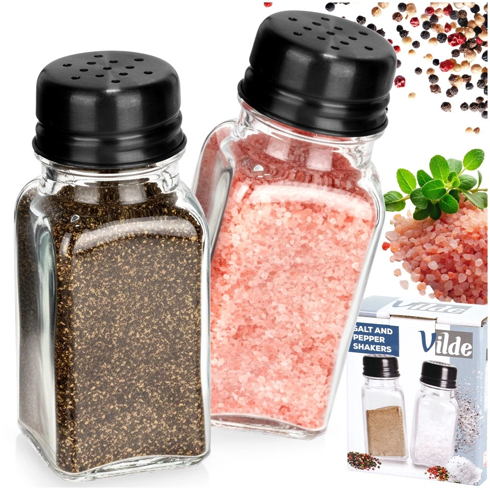 Két elegáns fűszertartó szett tartós, átlátszó üvegből, fekete fém tetőkkel, mindennapos használatra ideális. Az átlátszó test azonnali mennyiségellenőrzést biztosít, míg a perforált tető egyenletes és kontrollált adagolást tesz lehetővé sóhoz, borshoz és más szórható fűszerekhez.