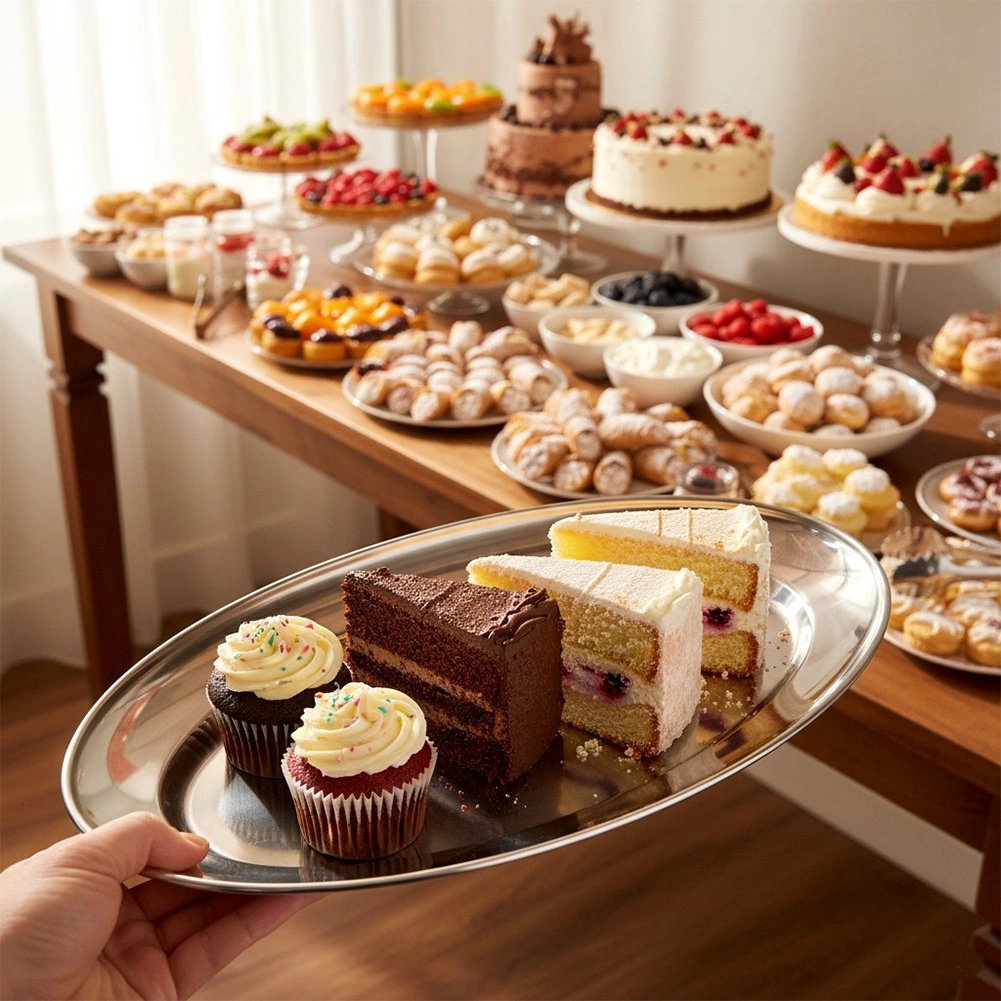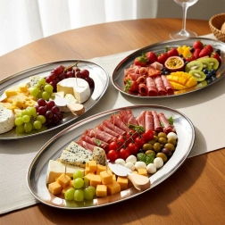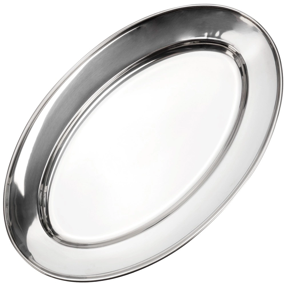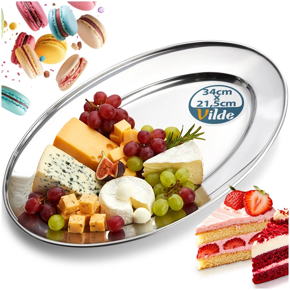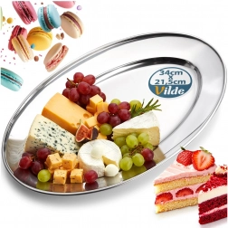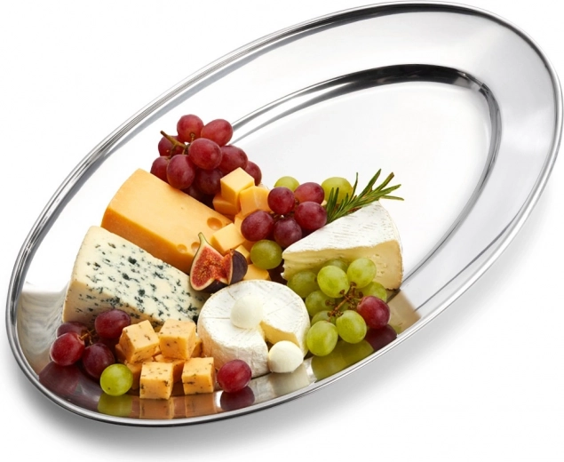 Stílusos, ovális szervírozó tálca minőségi rozsdamentes acélból, fényes, könnyen tisztítható felülettel és praktikus peremmel a biztonságos szállításhoz. Remek választás a mindennapokra és ünnepi alkalmakra – a brunchtól a családi összejövetelekig.