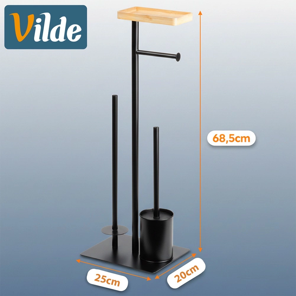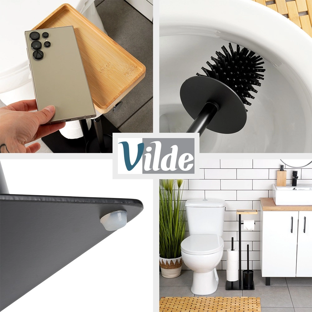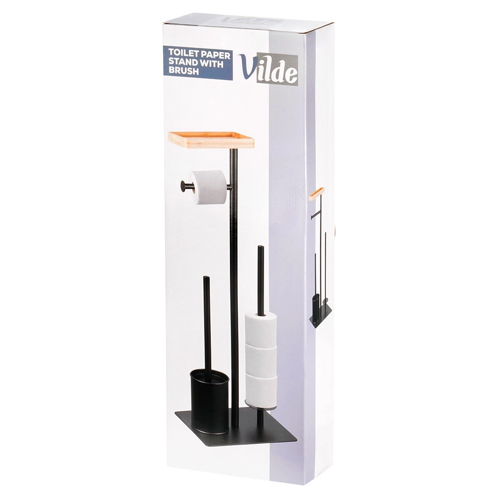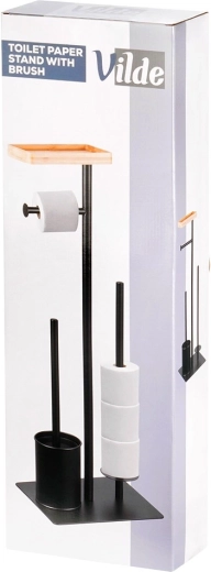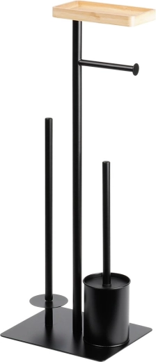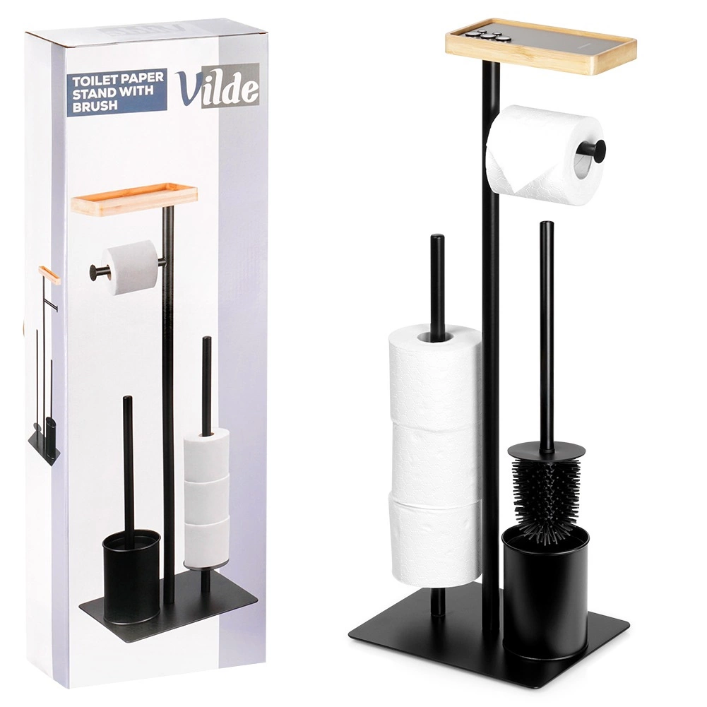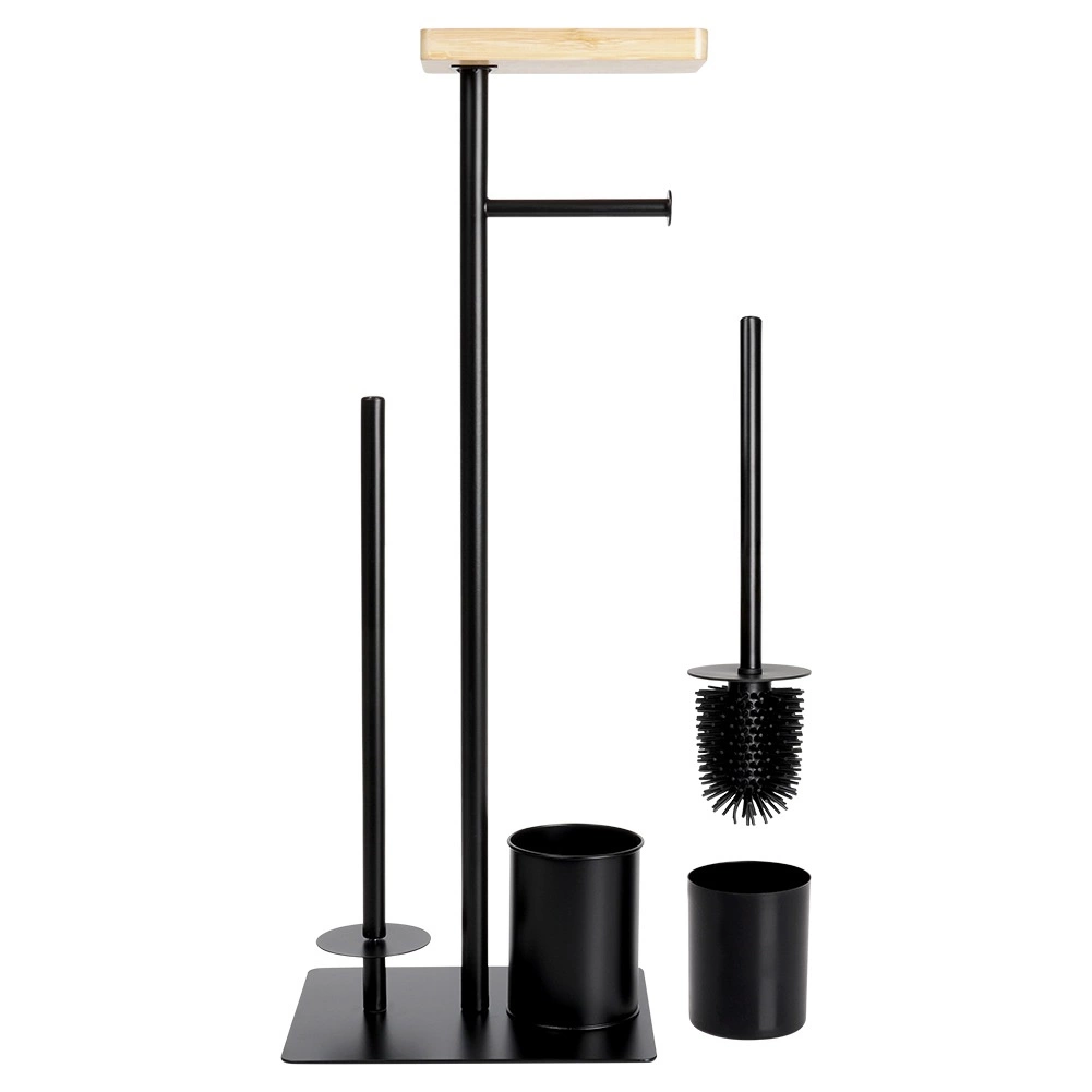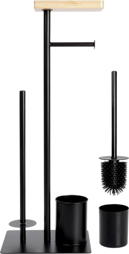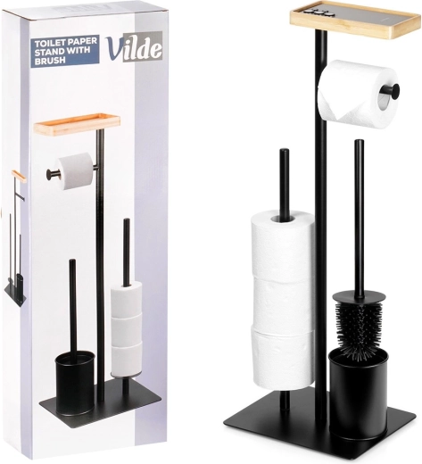 Praktikus 2 az 1-ben fürdőszobai segítő: WC-papírtartó állvány kefével elegáns fekete színben. Kínál tartót az aktuális gurigához, helyet 3 tartalék gurigának, szilikon sörtéjű WC-kefét és bambusz polcot telefon számára. A kompakt, 25 × 20 × 68,5 cm-es méretek és a stabil fémkonstrukció rendet és kényelmet biztosítanak minden fürdőszobában.