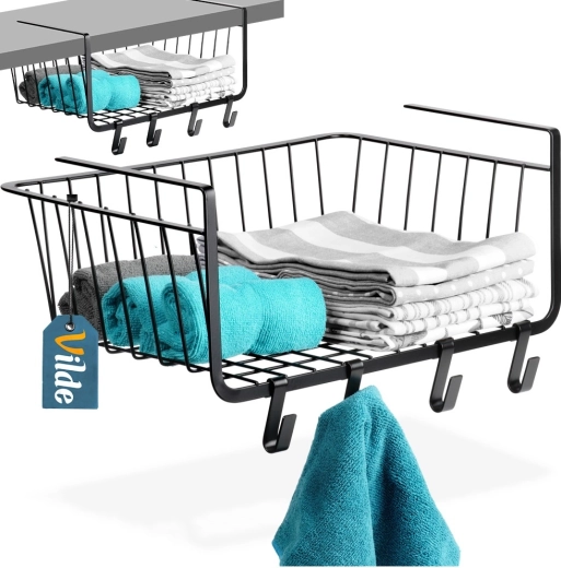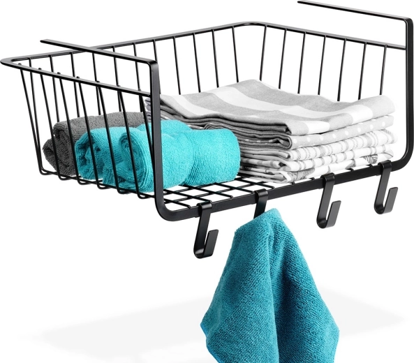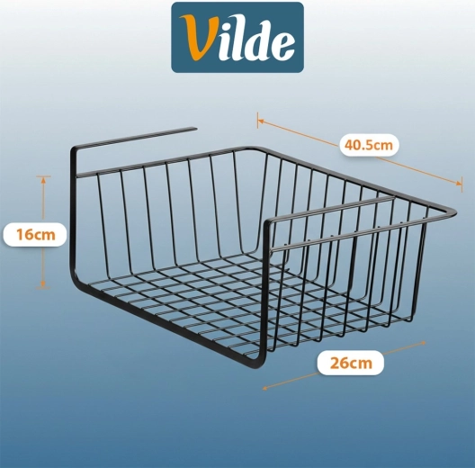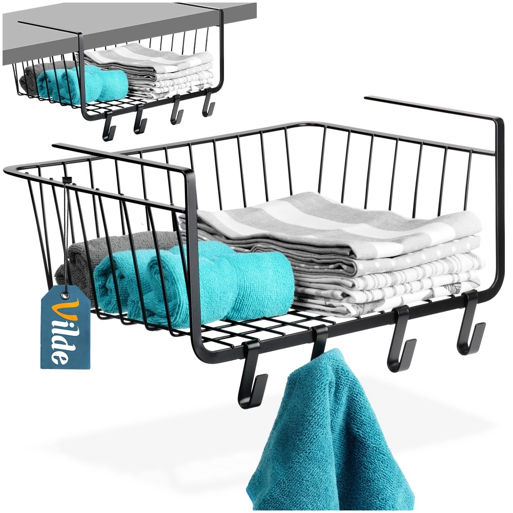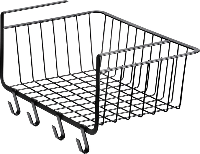 Praktikus, polc alá akasztható kosár 40,5 × 26 × 16 cm méretben, amely fúrás nélkül növeli a tárolóhelyet. Tartozékai a négy akasztó konyharuhák vagy kiegészítők felakasztásához. A kosár strapabíró fémből készült, fekete színben, sokoldalúan használható a konyhában, fürdőszobában, gardróbban és irodában, és lehetővé teszi a gyors, szerszám nélküli felszerelést.