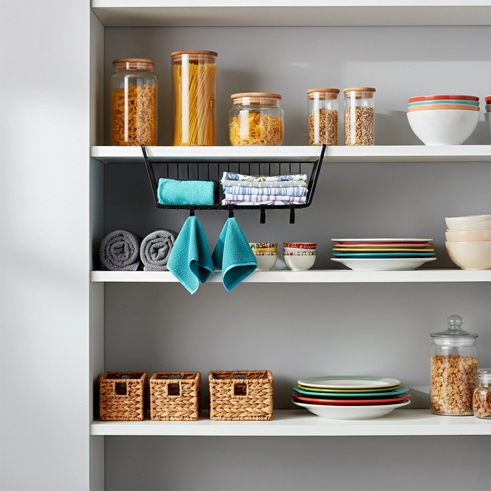 Szervezze okosan az otthonát fúrás nélkül. A függesztett kosarat egyszerűen a polc alá vagy a szekrény relingjére csúsztatja, és azonnal további tárolóhelyet nyer az átlátható rendszerezéshez: konyhai eszközöknek, fürdőszobai kiegészítőknek vagy textíliáknak. A csomagban 4 praktikus akasztó található konyharuhák, edényfogók vagy apró kiegészítők felakasztásához.