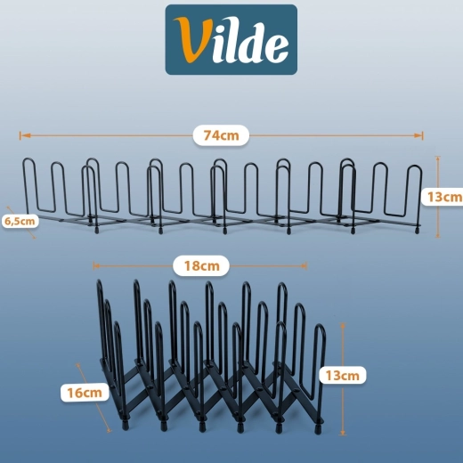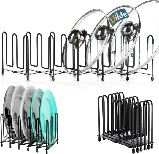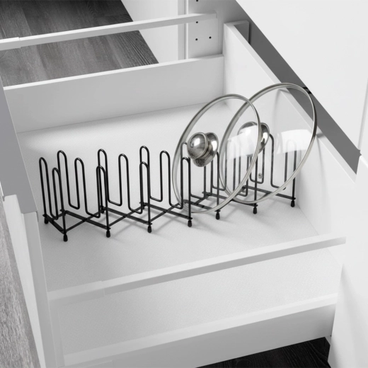 Tartsa rendben a konyhát a fedők, tányérok és vágódeszkák univerzális rendszerezőjével. A tartó könnyen igazodik a rendelkezésre álló helyhez és a tartalomhoz – 8 cm-től egészen 74 cm-ig. Ideális a munkalapra, szekrénybe vagy mély fiókba. A függőleges tárolás jobb áttekinthetőséget, gyors hozzáférést és védelmet nyújt az éleknek és felületeknek.