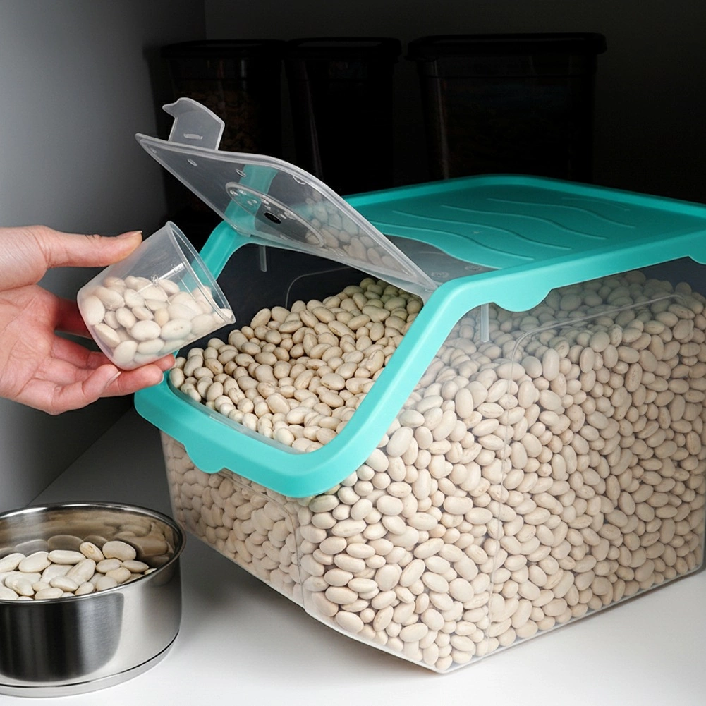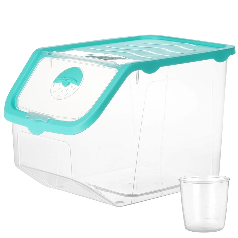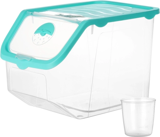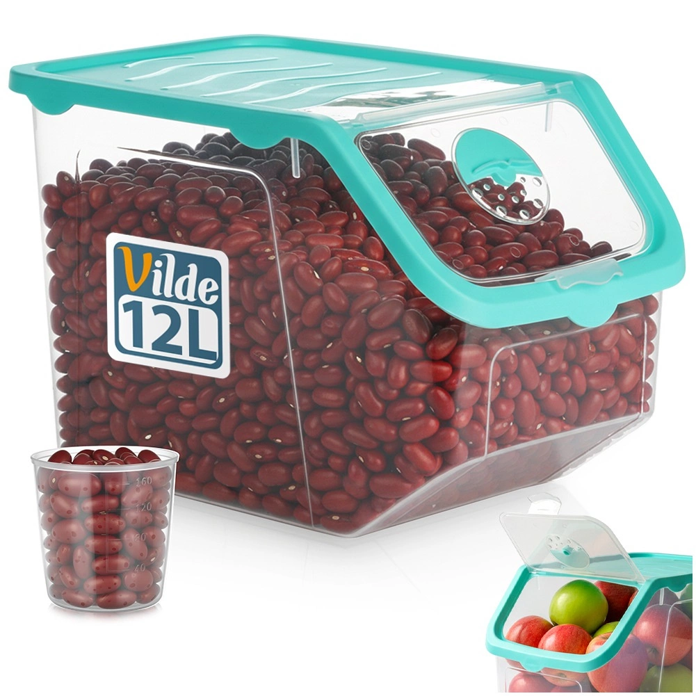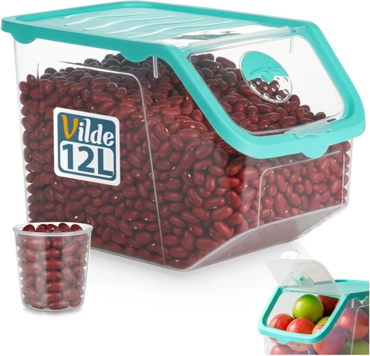 Praktikus és tartós, 12 literes élelmiszer-tároló doboz átlátszó testtel és türkiz fedéllel, amely rendet teremt a konyhában és a kamrában. A nyitható adagolófül az egyszerű adagoláshoz, a szabályozható szellőzés a hosszabb frissességért és a BPA-mentes, biztonságos anyag révén ideális gyümölcsök, zöldségek és szemes/száraz élelmiszerek tárolására. Mérőpohárral a pontos porciózáshoz.