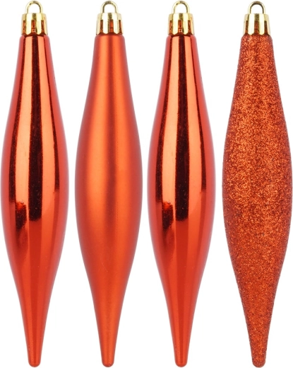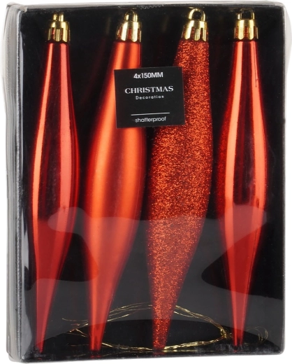 Elegáns, négy darabból álló karácsonyi díszkészlet jégcsap formában, telt piros színben, amely dekorációdnak csillogást és ünnepi hangulatot kölcsönöz. A díszek törhetetlenek, gyermekes és kisállatos háztartásokba is ideálisak, és fényes, matt és csillámos felületet kombinálnak az egyedi hatásért.