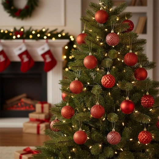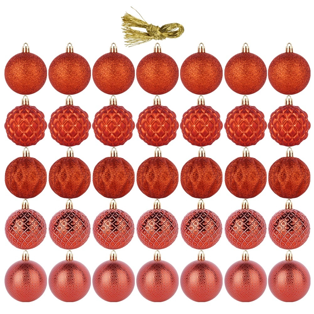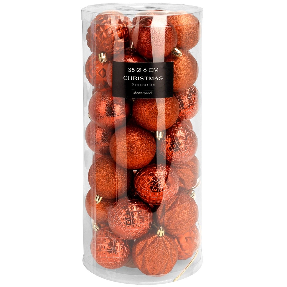 Stílusos 35 darabos piros karácsonyi gömb készlet 6 cm átmérővel a klasszikus ünnepi megjelenésért. A gömbök törhetetlenek, ideálisak gyermekes és kisállatos háztartásokba. Különböző felületkezelések – fényes, matt és csillámos – a látványos és változatos dekoráció érdekében a fán, koszorúkon és girlandokon.