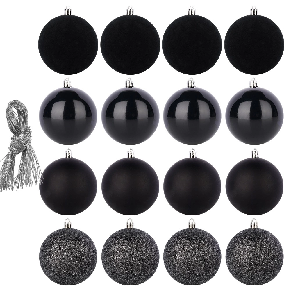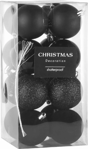 Elegáns készlet 16 fekete karácsonyi gömbbel, 6 cm átmérővel, matt, fényes, csillogó és bársonyhatású kivitelben. A törhetetlen anyagnak köszönhetően biztonságos gyerekek és háziállatok mellett is, és stílusos, ünnepi ragyogást ad a dekorációnak.