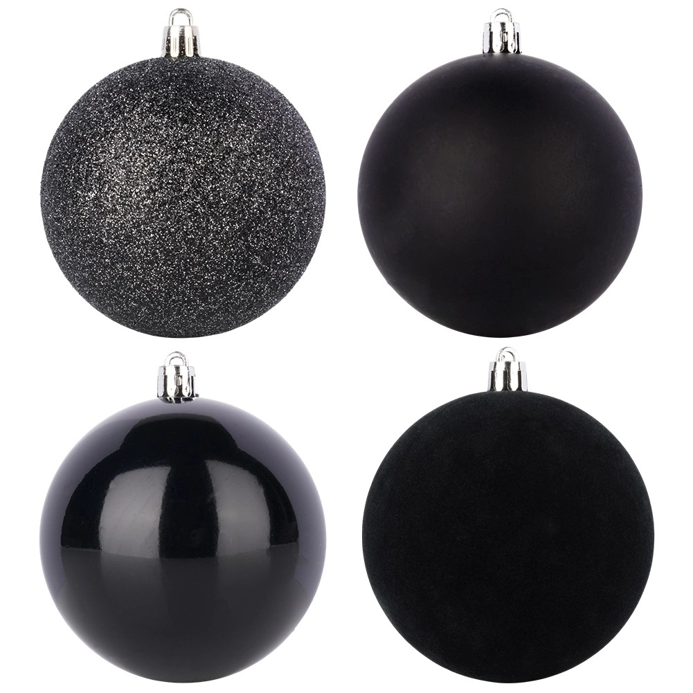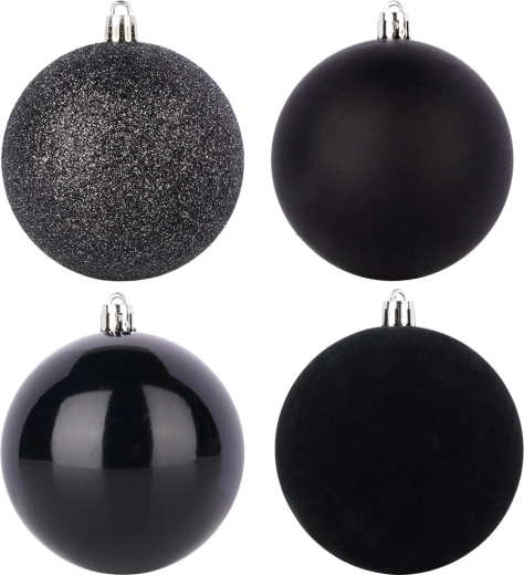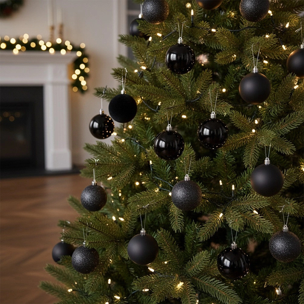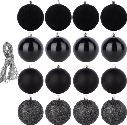 A készlet harmonikus felületkombinációt kínál: 4× matt, 4× fényes, 4× csillogó és 4× bársonyhatású gömb. Az egységes fekete árnyalat modern és elegáns, könnyen kombinálható más színekkel, és elbűvölő ünnepi hangulatot teremt.