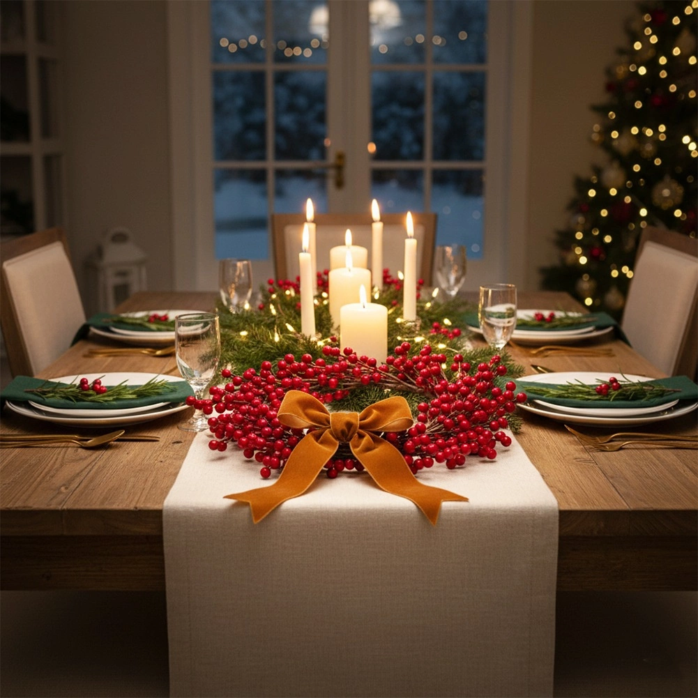 Elegáns, 50 cm átmérőjű karácsonyi koszorú sűrű ágacskákkal és apró magyaltermésekkel, amely feltűnő ünnepi dekoráció ajtóra, falra és asztalra. Tartós kivitelének köszönhetően sok szezonon át megőrzi színét és formáját. Mélypiros árnyalatai azonnal beragyogják a teret, és ünnepi hangulatot teremtenek.