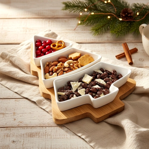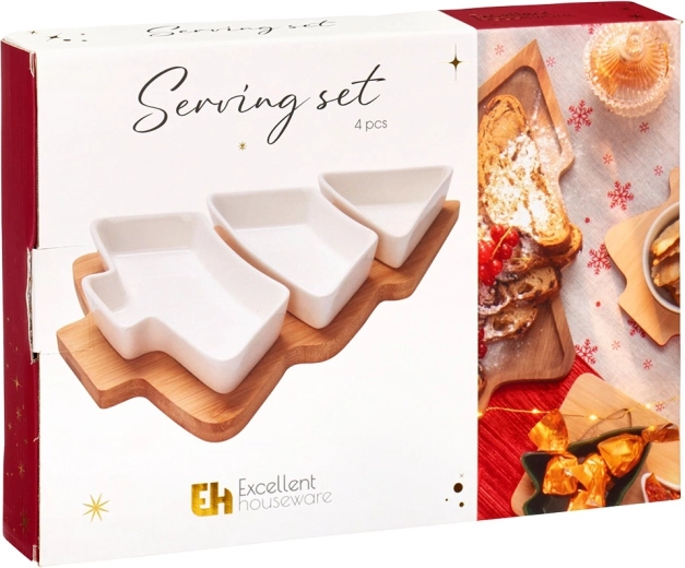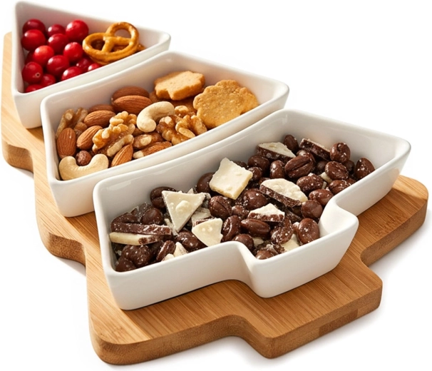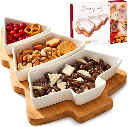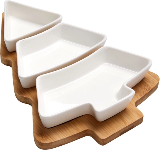 Stílusos tálalókészlet porcelán tálkákkal karácsonyfa alakú bambusztálcán. Ideális magvakhoz, olívához, mártogatósokhoz és antipastihoz ünnepi összejöveteleken. Az elegáns fehér porcelán és a természetes bambusz egyszerre dekoratív és praktikus. A tálkák mosogatógépben moshatók (a tálca nem).