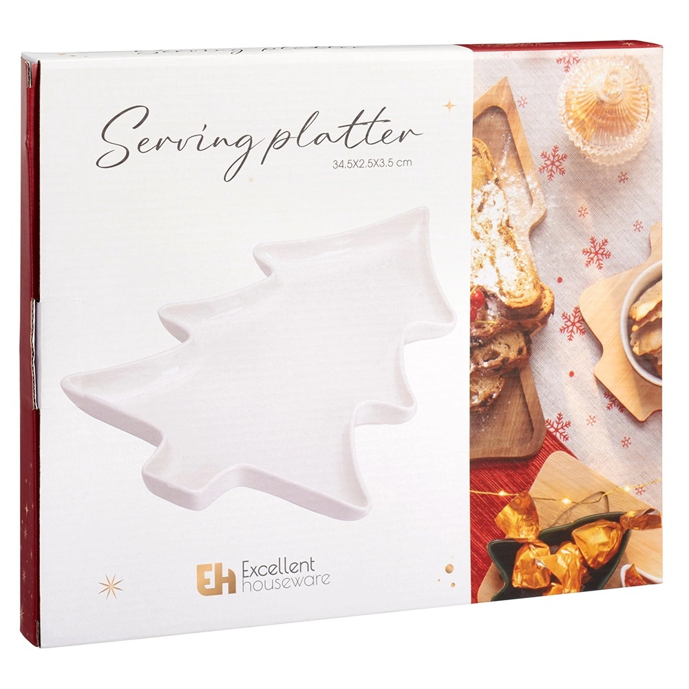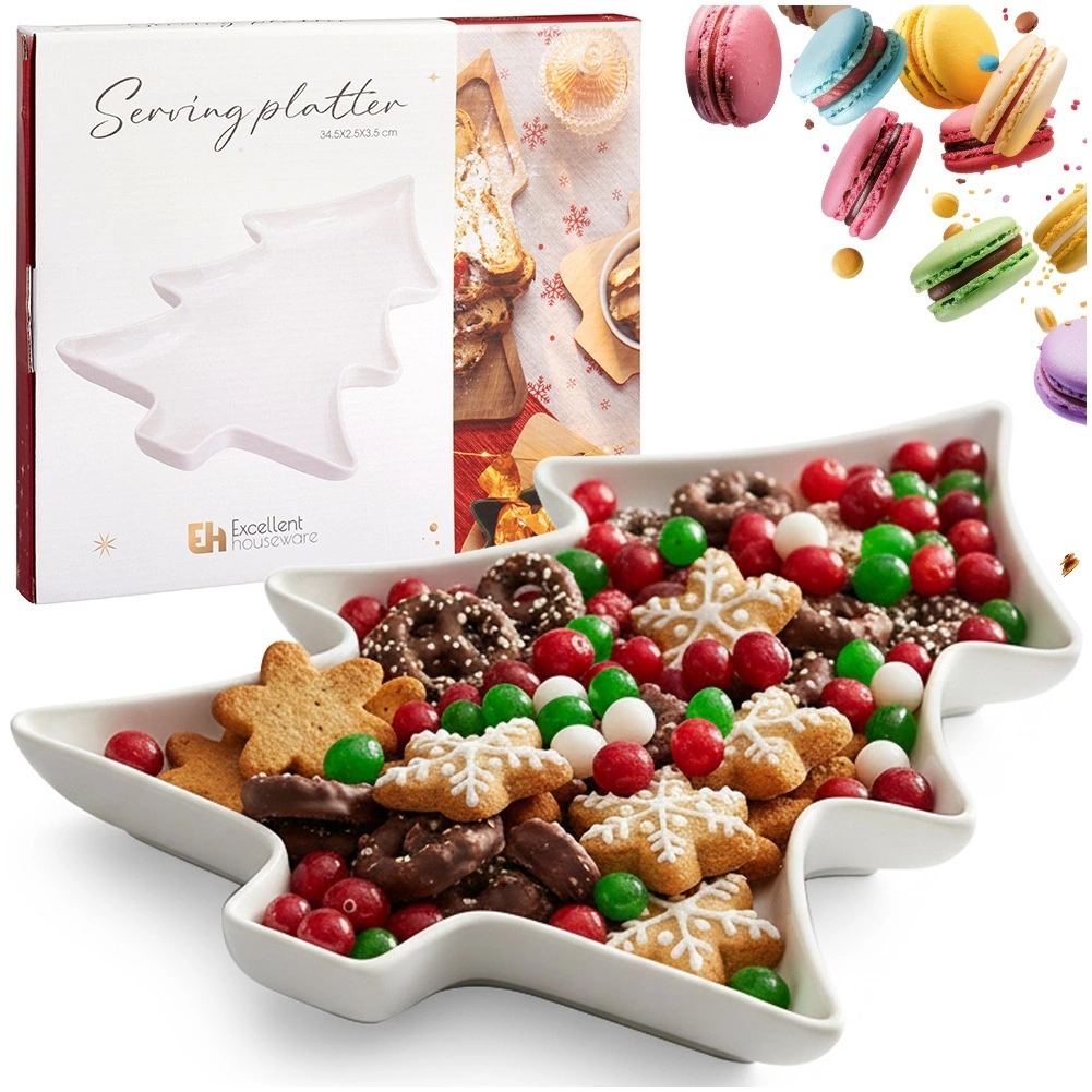Elegáns, karácsonyfa alakú porcelán tányér 35 × 26 × 3 cm méretben, ideális a stílusos tálaláshoz. Magas minőségű fehér porcelán, tágas felület és enyhén megemelt perem a sajtok, felvágottak, gyümölcsök vagy desszertek biztonságos kínálásához. Mosogatógépben és mikrohullámú sütőben használható, tökéletes az ünnepi asztalhoz.