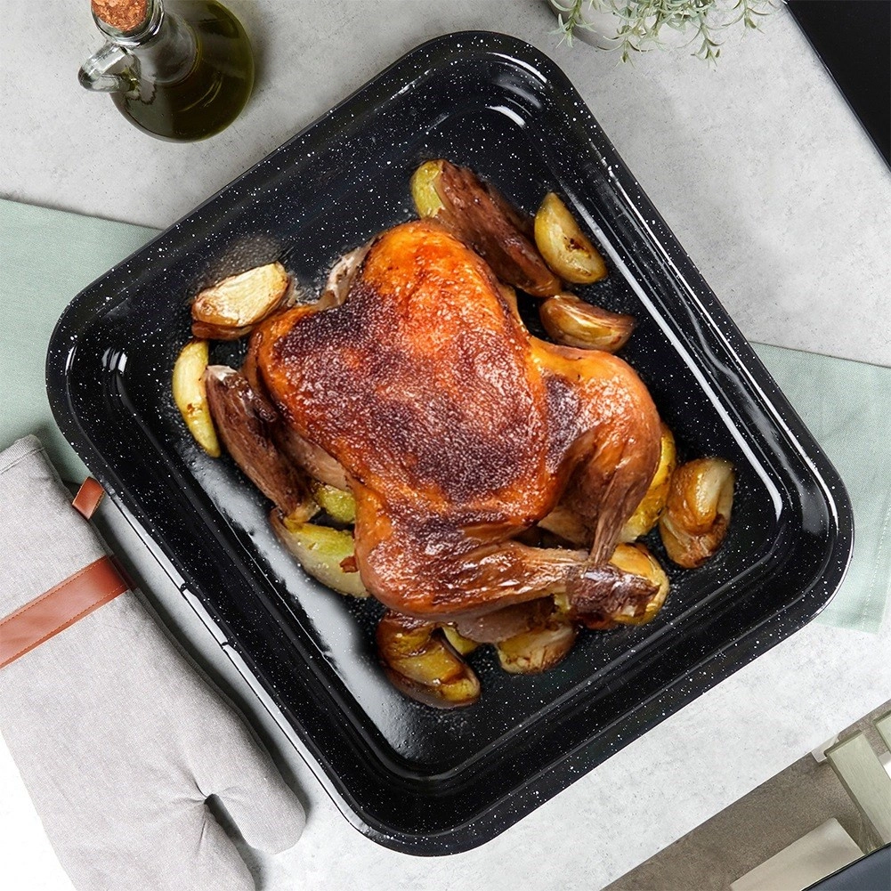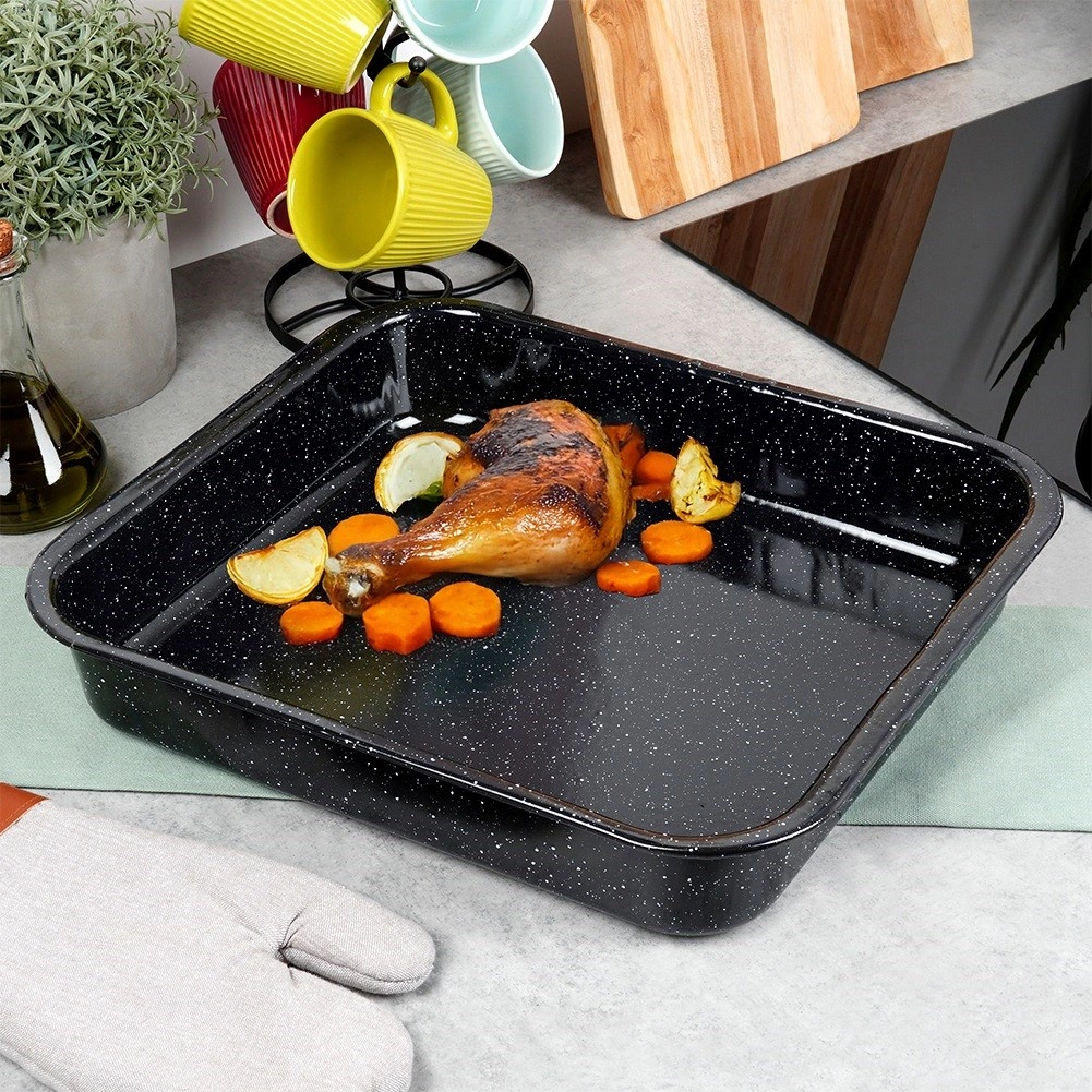 Strapabíró, sokoldalú tepsi fekete színű, minőségi zománcozott acélból, kiváló választás a mindennapi főzéshez. A nagy, 8 l űrtartalomnak és a 38 × 34 × 7 cm belső méreteknek köszönhetően kényelmesen elkészíthető benne sült hús, zöldség, magas peremű házi pizza vagy tartalmas rakott ételek. A zománcozott felület egészségkímélő, allergiások számára is megfelelő.