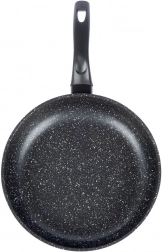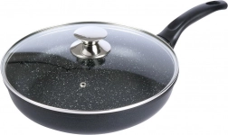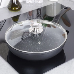 Masszív, 28 cm átmérőjű gránit serpenyő üvegfedővel a mindennapi főzéshez. A PFOA- és PTFE-mentes tapadásmentes felületnek köszönhetően minimális zsiradékkal készíthet ételeket, a hő egyenletesen oszlik el, az ergonomikus nyél pedig hideg marad érintésre. Alkalmas minden tűzhelytípushoz, beleértve az indukciót is, és mosogatógépben mosható.