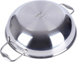 A szegecselt oldalsó fogantyúk stabil fogást adnak. A felület kézzel és mosogatógépben is könnyen tisztítható, ellenáll a főzés utáni lerakódásoknak és foltoknak.
