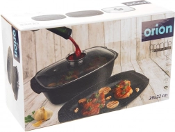 Csomag tartalma: 1× mély, téglalap alakú tepsi (külső: 39 × 22 × 10 cm; belső: 32 × 21 × 9,5 cm; 5 l), 1× grillserpenyő/fedő (külső: 39 × 22 × 5 cm; belső: 31 × 20 × 4 cm; 2 l), 1× üvegfedő (külső: 34 × 22,5 × 6,5 cm). ORION – eredeti termék, európai szabványok szerint gyártva.