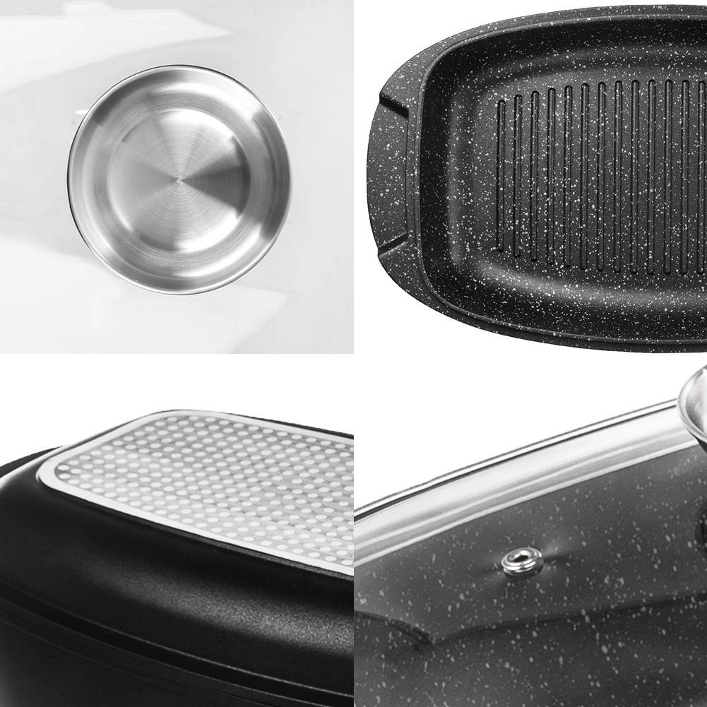 Az üvegfedőbe integrált adagolónak köszönhetően főzés közben kényelmesen hozzáönthet vizet, alaplevet vagy bort a fedő felnyitása nélkül. Mindkét rész (tepsi és grillserpenyő) kompatibilis minden típusú tűzhellyel, beleértve az indukciót, és a sütőben is használható 200 °C-ig. A kényelmes oldalsó fogantyúk megkönnyítik a kezelést, a teljes készlet pedig mosogatógépben mosható.