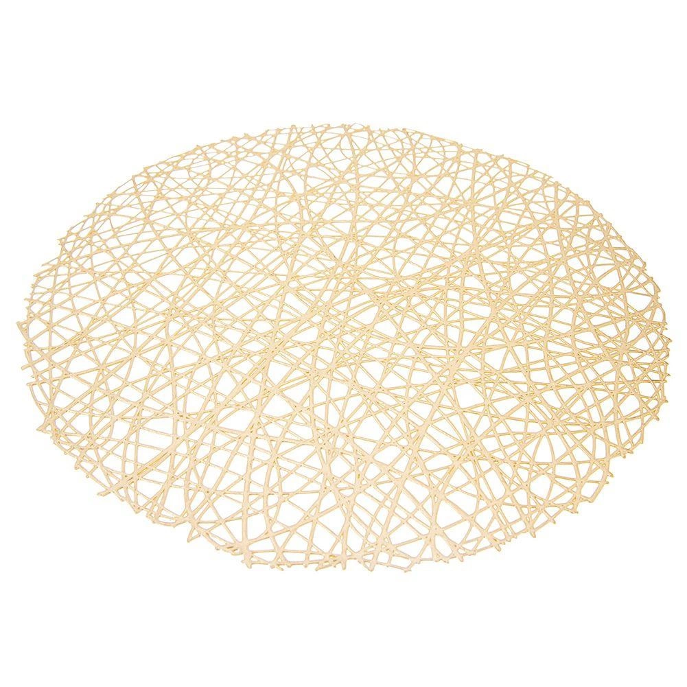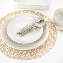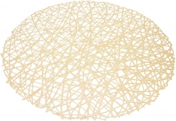 Elegáns, kerek asztali alátét 39 cm átmérővel arany színben, amely luxus megjelenést kölcsönöz az asztalnak, és megbízható védelmet nyújt. Rugalmas, könnyen tisztítható és praktikus a mindennapi használathoz a konyhában és a nappaliban egyaránt. Védi a felületet a karcolásoktól és szennyeződésektől, valamint dekoratív hátteret ad a tányéroknak és evőeszközöknek.