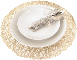 Ez a kerek, arany színű alátét kiváló kiegészítő az étkezőasztalhoz és a dohányzóasztalhoz is. Fényes felületének köszönhetően rendkívül elegáns hatást kelt, és könnyen kombinálható klasszikus és modern enteriőrökkel. Alkalmas tányérok, evőeszközök és dekorációk alá, miközben megbízhatóan védi az asztallapot.