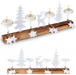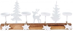 Ez a stílusos gyertyatartó a természetes fa és a matt fehér fém párosításával ideális választás téli és karácsonyi dekorációhoz. A fém sziluettek – fenyők, szarvas és függő csillagok – látványosan mutatnak az étkezőasztalon, a komódon vagy akár az ablakpárkányon. A négy tányérka révén tökéletes adventi dekoráció.