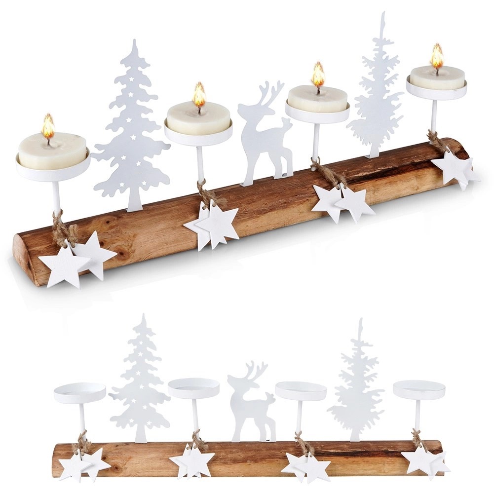 Elegáns gyertyatartó természetes fa talppal és fehér fém fenyő- és szarvassziluettekkel, amelyek otthonában meghitt, ünnepi hangulatot teremtenek. Legfeljebb 4 teamécsest fogad (akár 5 cm átmérőig), stabil és tartós, és kiválóan használható adventi gyertyatartóként, valamint szezonális dekorációként modern és klasszikus enteriőrben egyaránt.