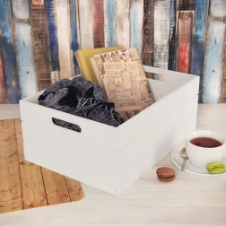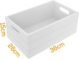 Praktikus, fehér színű fa tárolóláda, amely segít rendet tartani otthon és az irodában. Mérete 36 × 26 × 15 cm, masszív fából készült, és az oldalsó fogantyúknak köszönhetően könnyen hordozható. Remekül használható kozmetikumokhoz, irodaszerekhez, gardróbkiegészítőkhöz vagy konyhai eszközökhöz. Univerzális, strapabíró, sokoldalú és egyben dekoratív is.