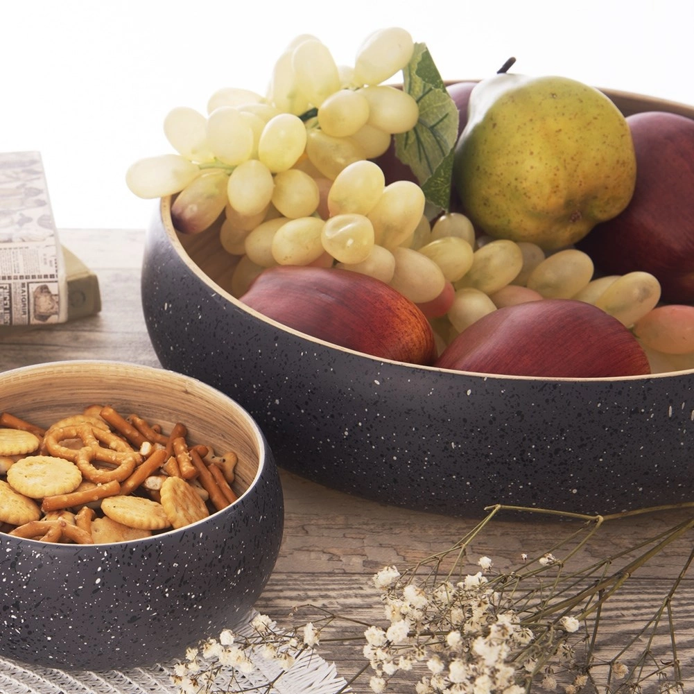 A világos bambuszfa és a szürke, pettyezett felület kombinációja elegáns, időtálló kiegészítőt alkot tálaláshoz és dekorációhoz.