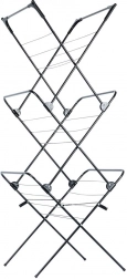 Praktikus, háromszintes, függőleges ruhaszárító akár 14,5 m szárítófelülettel, stabil fém szerkezettel és helytakarékos, összecsukható kialakítással. Kompakt méreteinek köszönhetően ideális kis lakásokba, erkélyre vagy teraszra, és akár 15 kg ruhát is elbír.