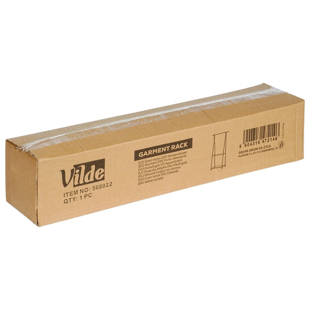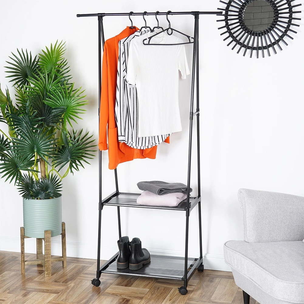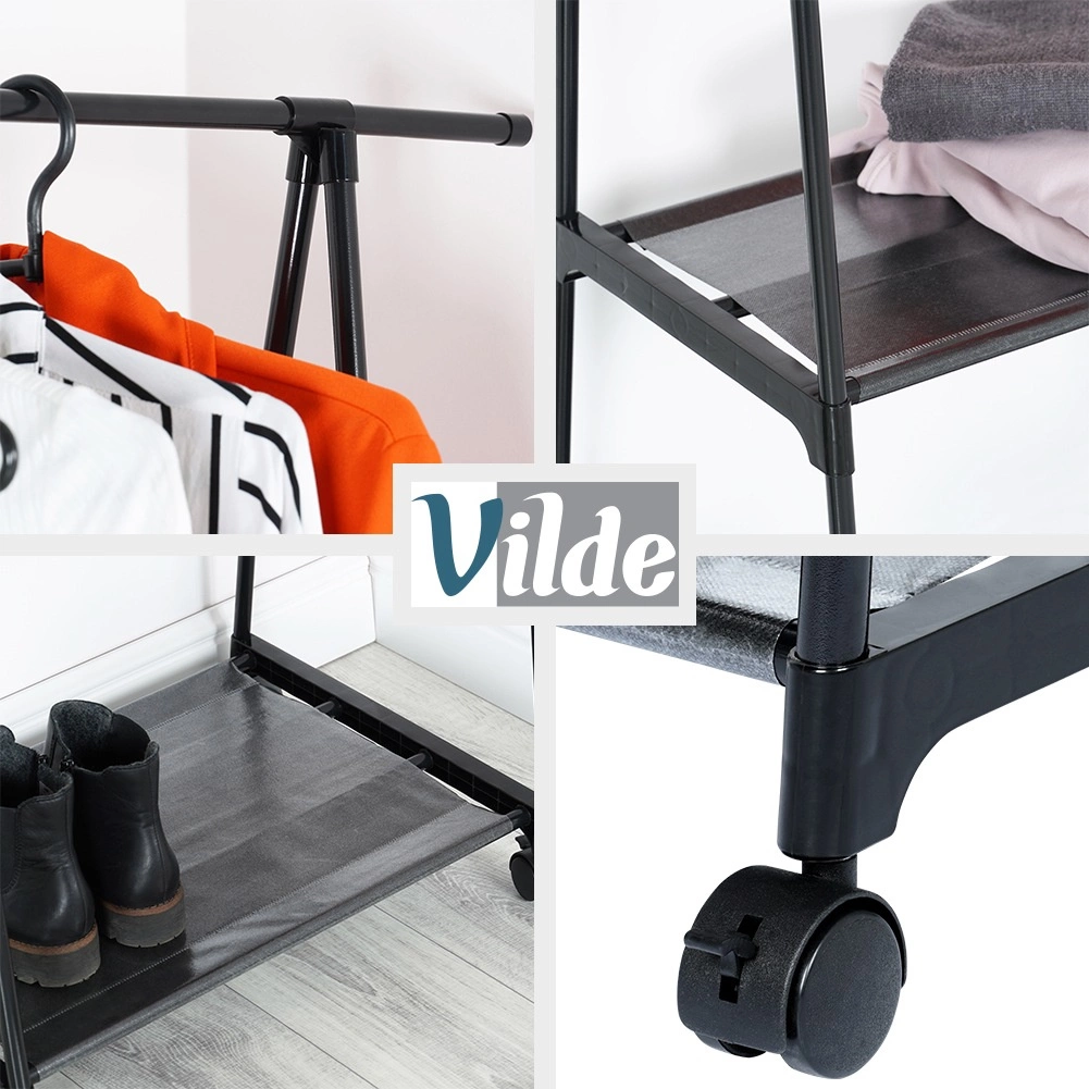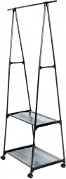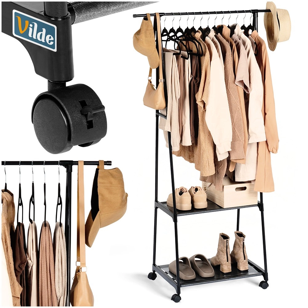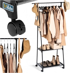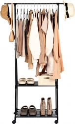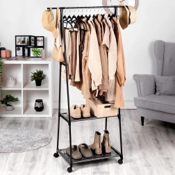 Az elegáns, loft ipari stílusú állvány tágas felső rúddal rendelkezik a ruhák felakasztásához és két alsó polccal a cipők, táskák vagy tárolódobozok számára. A fekete színű teljes fém kivitel masszív, stabil és könnyen tisztítható, a poliészter textilpolcok könnyűek és tartósak.