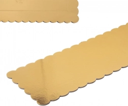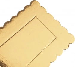 Elegáns, arany színű tortaalátét 33 × 12 cm méretben, dekoratív hullámos peremmel. Kétoldalas, masszív kartonból készül, mindkét oldalán védőfóliával bevonva, így ellenáll a nedvességnek és hűtőszekrényben is használható. Stabil alátámasztást biztosít a hordozáshoz és a biztonságos szállításhoz, még nehezebb torták és sütemények esetén is, és egyben reprezentatív tálalást nyújt.