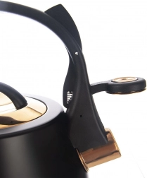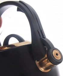 Stílusos, rozsdamentes acél vízforraló fekete és arany kombinációban, amely modern és klasszikus konyhák éke lesz. A széles, stabil alapnak és a minőségi anyagnak köszönhetően gyorsan és takarékosan melegíti fel a vizet, anélkül hogy befolyásolná annak ízét. A felhajtható síp megbízhatóan jelzi a forrást, míg a kényelmes, hőálló fogantyú biztonságos fogást nyújt.