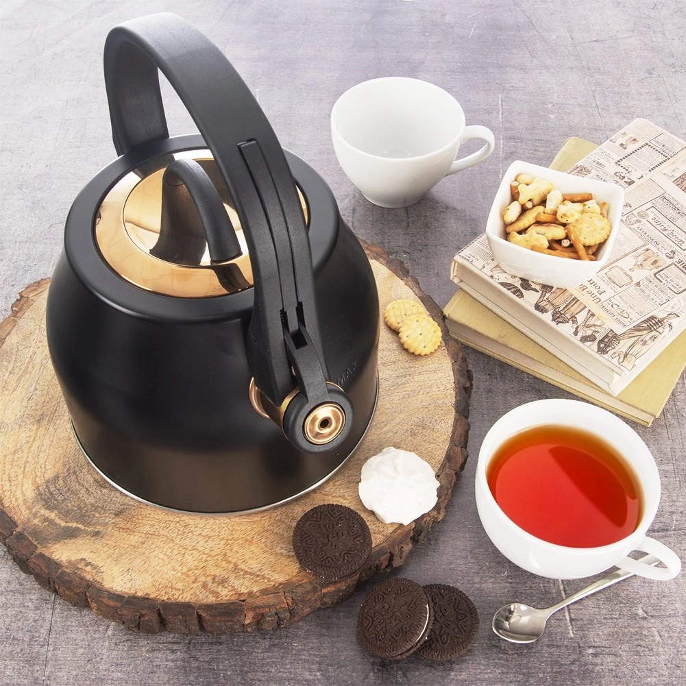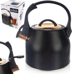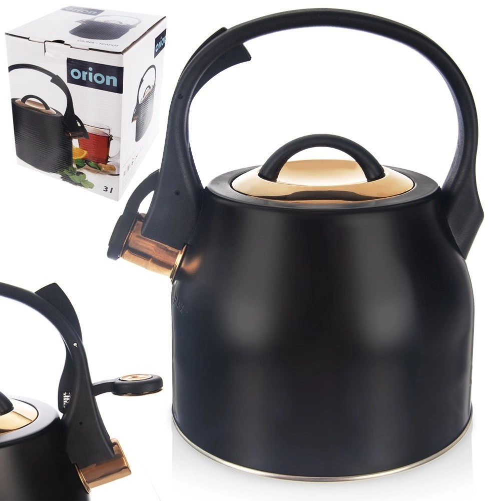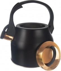 Elegáns, matt fekete acél sípoló vízforraló arany részletekkel, amely ötvözi a stílust és a funkcionalitást. Űrtartalma 3 l (hasznos 1,8 l), ergonomikus fogantyúval, felhajtható síppal és könnyen levehető fedéllel rendelkezik. Minden típusú tűzhelyhez, beleértve az indukcióst is alkalmas, és kiválóan megfelel a mindennapi vízforraláshoz teához, kávéhoz és gyógynövényekhez.