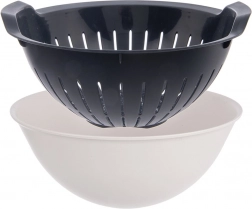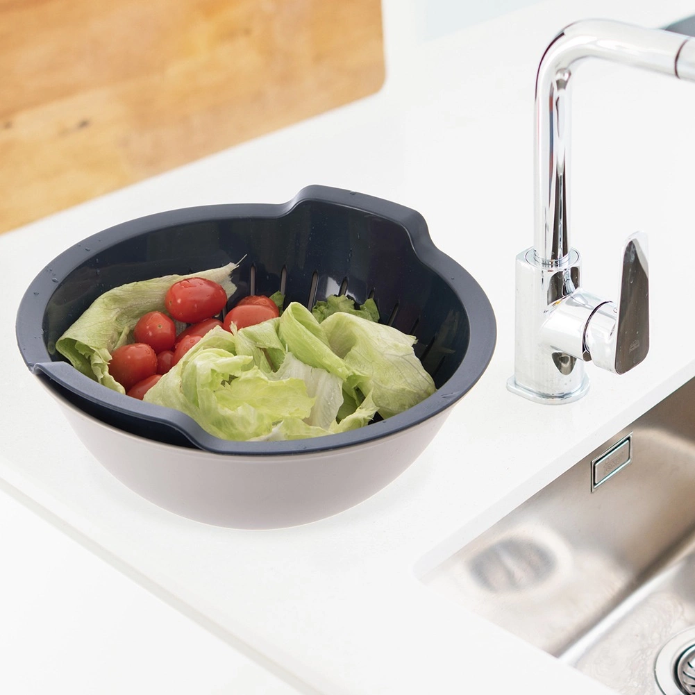 A két rész együtt és külön is használható: a szűrő tésztához, burgonyához vagy saláta és gyümölcs öblítéséhez, a tál palacsintatészta keveréséhez, saláták készítéséhez vagy tálaláshoz. A BPA-mentes anyag +95 °C-ig ellenálló, mosogatógépben könnyen tisztítható, a tál mikrohullámú sütőben is használható.