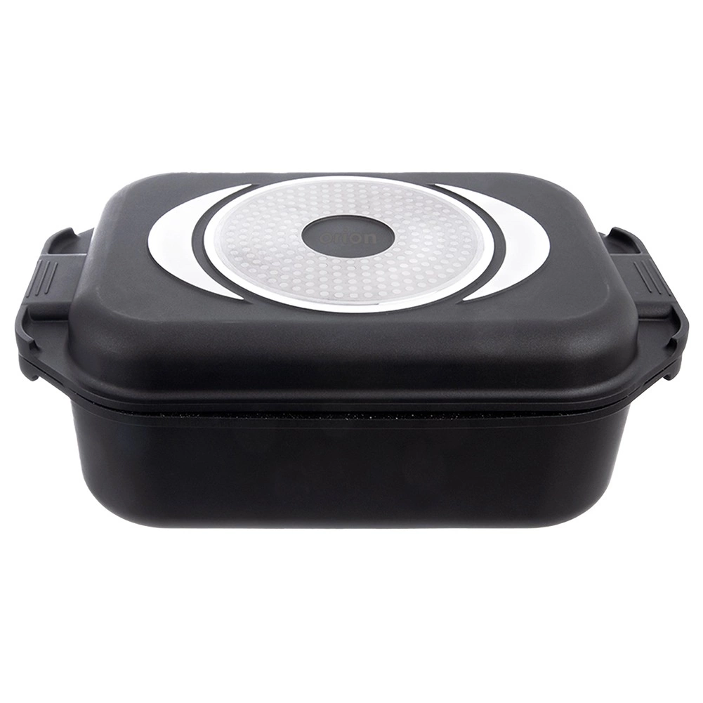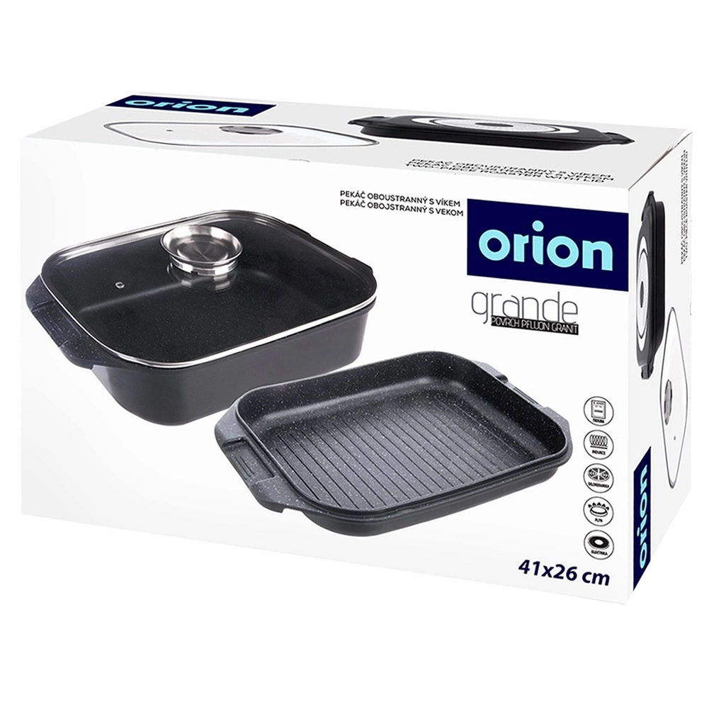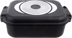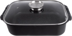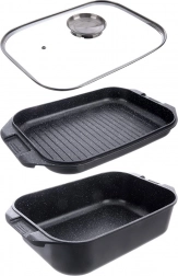 Sokoldalú, 3 az 1-ben gránit tepsi sütéshez, pároláshoz és sütéshez 7 l űrtartalommal. A csomag része egy grillserpenyő fedőként és egy hőálló üvegfedő adagolóval. A strapabíró alumíniumöntvény tapadásmentes, dupla gránit PFLUON GRANIT bevonattal lehetővé teszi a főzést minimális zsiradékkal, és kiválóan tárolja a hőt. Alkalmas gáz-, elektromos-, kerámia- és indukciós tűzhelyre, sütőbe 230 °C-ig (üvegfedővel 200 °C-ig), és mosogatógépben mosható.