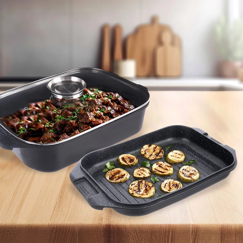 Univerzális szett a mindennapi főzéshez: tágas, 7 l-es tepsi fedőként használható grillserpenyővel és külön hőálló üvegfedővel folyékony fűszeradagolóval. Az ikerrétegű gránit PFLUON GRANIT bevonat az alumíniumöntvényen kiváló tapadásmentességet, egyenletes hőeloszlást és könnyebb tisztítást biztosít.