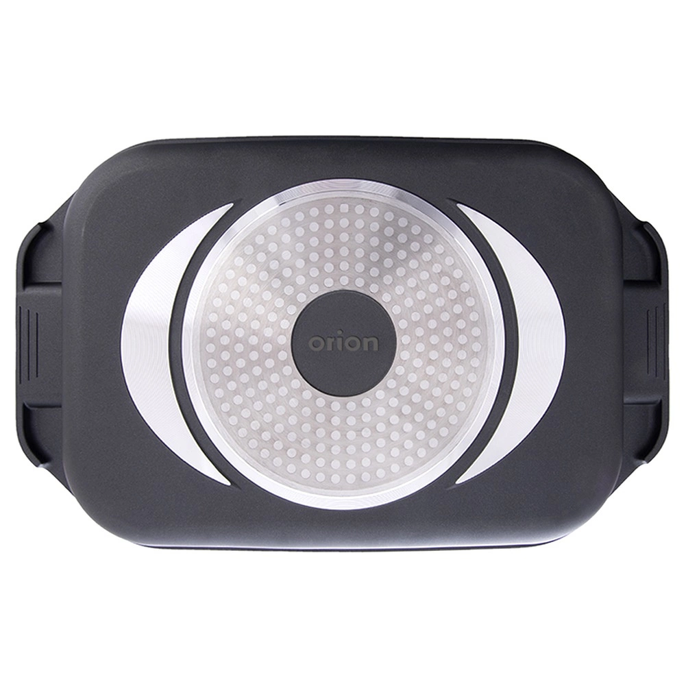 A grillserpenyő önállóan vagy a tepsi fedőjeként is használható – ideális sütéshez, pirításhoz és pároláshoz. A praktikus adagolóval ellátott üvegfedő lehetővé teszi víz, bor vagy folyékony fűszerek hozzáadását a fedő megemelése nélkül. A külső oldal tapadásmentes PTFE réteggel van ellátva a könnyű karbantartás érdekében.