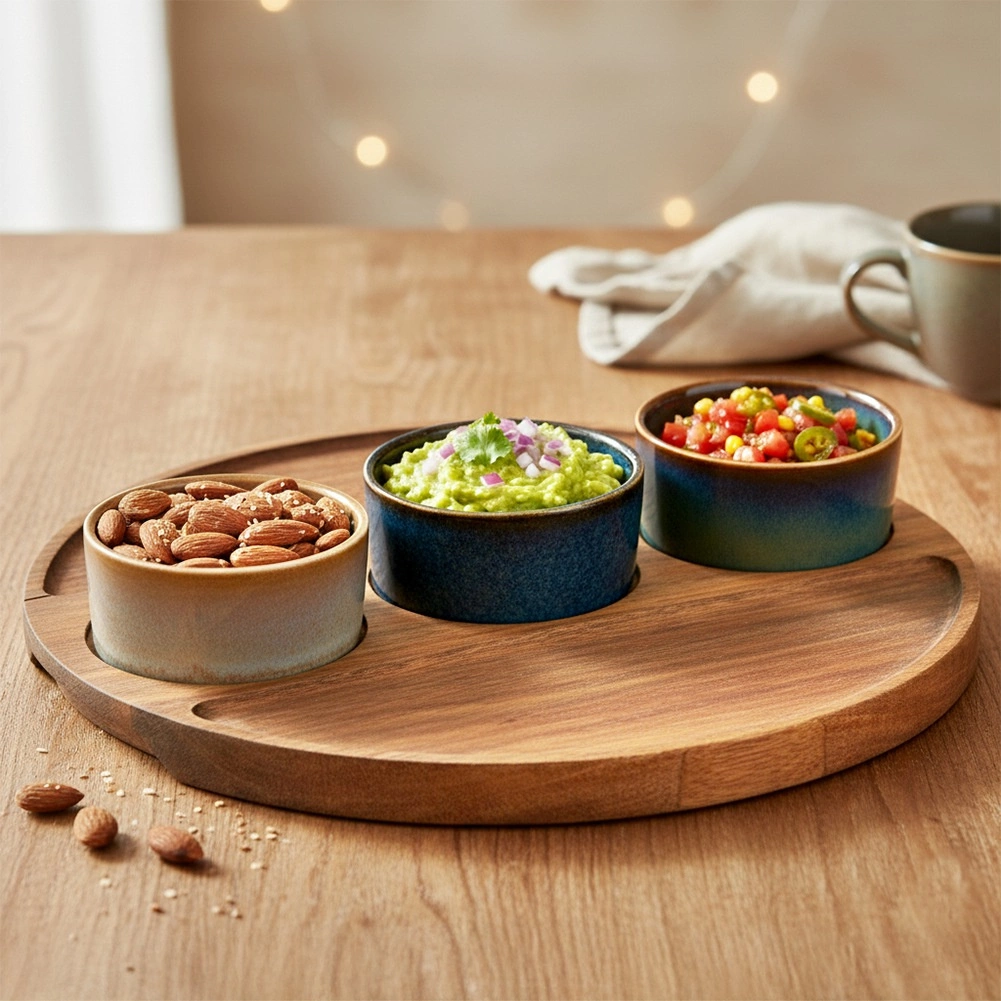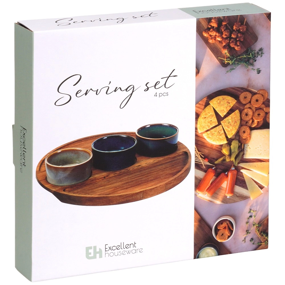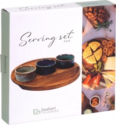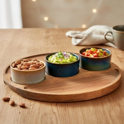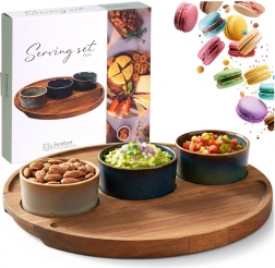 Stílusos, 4 részes szervírozó készlet fa tálcával és három kerámia tálkával, ideális olajbogyóhoz, magvakhoz, mártogatósokhoz és antipastihoz. Minden tálka egyedi mázzal készül, az akácfa tálcán kimart mélyedések biztosítják a stabilitást. A szett méretei: 25 × 25 × 4,5 cm, a tálkák 7 × 3 cm, űrtartalom 65 ml. A tálkák mosogatógépben tisztíthatók (a tálca nélkül).