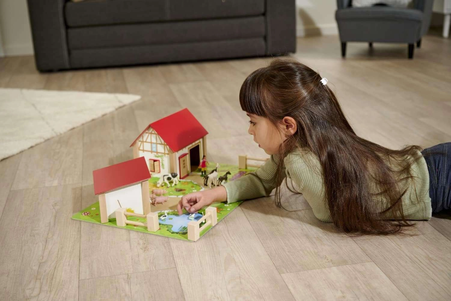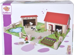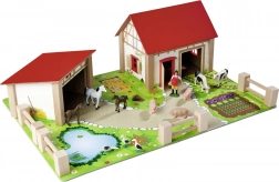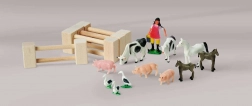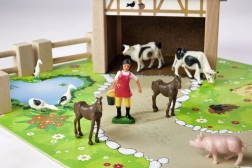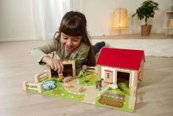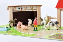 A készlet része egy nagy ház kifutóval és istállóval, színes alap 51 × 36 cm, kerítések és 12 figura állatokkal és egy farmer figurával. A játék támogatja a koordinációt, a színek és formák tanulását, valamint a háziállatok megismerését.
