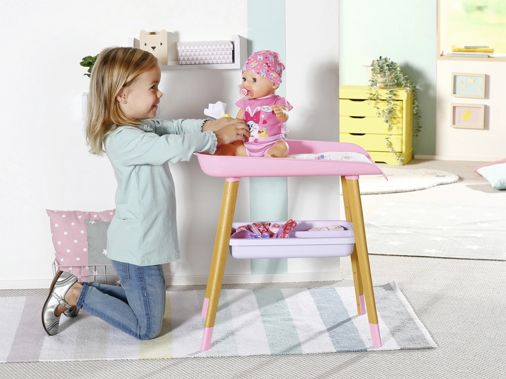 A stílusos BABY born pelenkázóasztal valósághű gondoskodós játékot kínál a gyerekeknek. Fautánzatú lábakkal, puha pelenkázó alátéttel, levehető törlőkendő-adagolóval kiskacsával és praktikus rekeszekkel a pelenkák, ruhácskák és kiegészítők számára. Tökéletesen illik a gyerekszobába, és harmonizál más BABY born kiegészítőkkel.