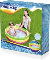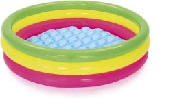 Az 102 cm átmérőjű és 25 cm magas, könnyű és kompakt medence remek választás 2 éves kortól. A három színes gyűrű külön szelepekkel stabilitást és biztonságot nyújt játék közben, míg a felfújható alj extra kényelmet biztosít még keményebb felületeken is. A 62 literes kapacitás épp megfelelő a kellemes felfrissüléshez és az első vízi játékokhoz.