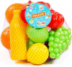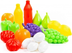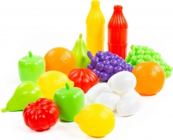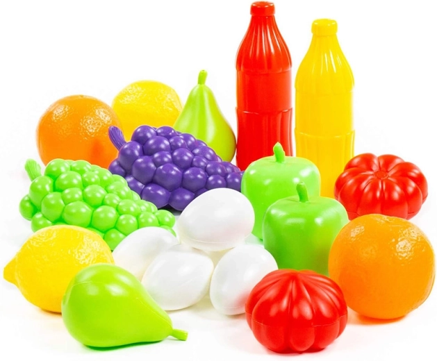 A készlet tartalmaz szőlőt, almát, citrusféléket, paradicsomot és további darabokat, amelyek ösztönzik a fantáziát, és segítenek a gyerekeknek megkülönböztetni az élelmiszerfajtákat és a színeket.
