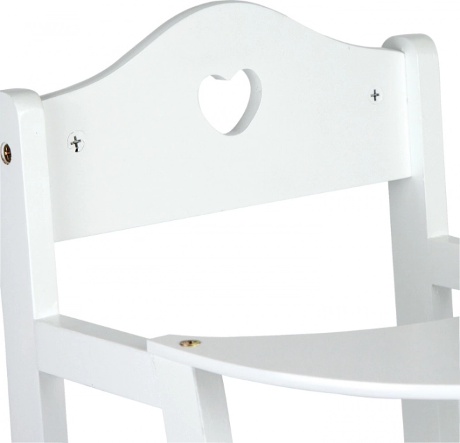 Ez a tiszta fehér színű fa etetőszék babáknak stílusos kiegészítője a gyerekszobának és a nappalinak egyaránt. A visszafogott szívalakú kivágás a háttámlán kedves megjelenést ad, míg a masszív felépítés biztonságos és tartós szórakozást nyújt.